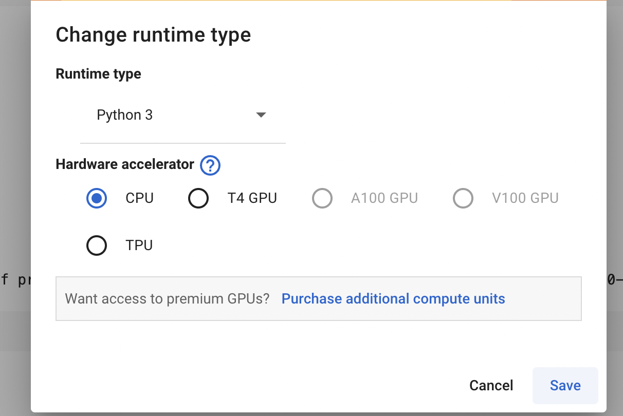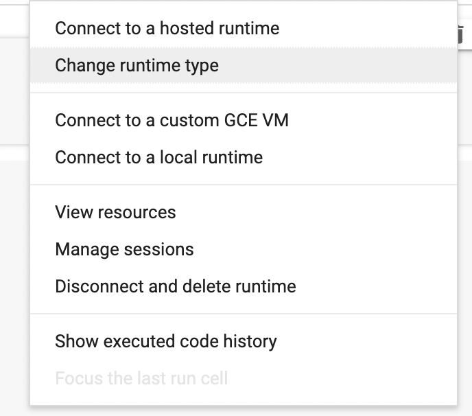 Using Colab, I will start with the CPU. To switch between both runtime environments, go to the right-hand side of the interface. You should see something like Connect. Click on it, and you will see the image below, select change runtime type, and a modal will pop up, then select the runtime you need, either CPU or GPU. You can use any of these for this tutorial.